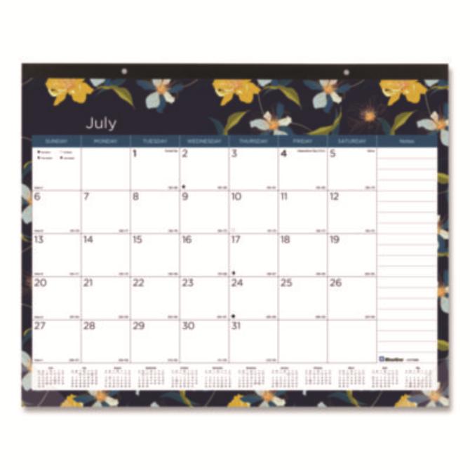 Track important school events, exam days, project due dates and more with this Academic 18-Month Desk Pad Calendar. Its one month per sheet, one block per day format features a handy ruled notes column on right-hand margin to ensure you have plenty of space to capture all the important details, and a full-year reference calendar at the bottom of each sheet helps make long-term planning easy. A reinforced chipboard back provides a solid writing surface, and clear vinyl corners keep the sheets flat without obscuring your view. Each sheet is printed on high-quality paper to reduce the potential for ink-bleed-through, and easy-tear perforations enable clean removal at the end of the month. The secure-bind headband keeps everything neatly together, while its pre-punched eyelets deliver dual-purpose, desk-pad/wall-calendar flexibility. Dated: Yes; Academic Year: Yes; Calendar Format: Monthly; Calendar Spread Format: One Month per Page.
