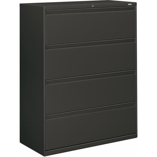 Four-drawer lateral file offers clean lines, reinforced case construction, 42" width, dual side locks for security, and full-width, designer-style handles. Baked enamel finish over rust-inhibiting, phosphate pretreatment adds more durability. Three-part, telescoping, ball-bearing suspension delivers smooth drawer operation. Drawers accommodate letter-size or legal-size folders from side-to-side with included adjustable hangrails. Drawers are flush at the top and sides and feature drawer-extension restraint. Mechanical interlock allows only one drawer to open at a time. Charcoal lateral file also offers four adjustable leveling guides for stabilizing and HON One Key interchangeable, core-removable lock. Lock mechanism secures both sides of drawers.