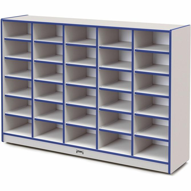 30-tub mobile storage unit without bins provides tons of storage space for individual students or classroom supplies. Laminate is durable and features an easy-to-clean surface. MAXBrackets allow the art center to be moved effortlessly from room to room without causing stress on the wheels and brackets. Wheels are made of hard rubber and won't leave black marks on your floor. TRUEdge is permanently thermo-fused to the edges to prevent chipping. Standard Write-n-Wipe recessed backs can be easily wiped clean.