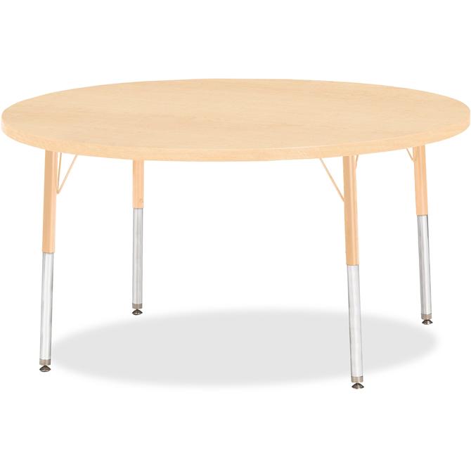 Round activity table for adults is perfectly sized to let you work comfortably. Laminate is durable and features an easy-to-clean surface. TRUEdge is permanently thermo-fused to the edges to prevent chipping. Extra-safe, dual-screw steel legs allow you to easily adjust the height of the table. Powder-coated, adjustable legs can be repositioned in 1" increments to provide maximum comfort. Leg guides reduce squeaks, prevent snags and eliminate rusting.