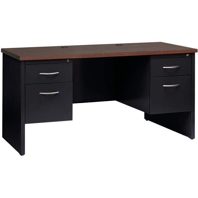 Double-pedestal credenza is part of the Lorell Commercial Steel Desk Series with commercial-quality performance and components. Durable steel chassis supports a 1-1/8" thick, laminated top. Laminate is stain-resistant and scratch-resistant for durability. This 60" wide, double-pedestal credenza with adjustable leveling glides can be used freestanding or paired with a stack-on hutch and other elements to create an executive workstation. Each locking pedestal includes one box drawer for small supplies and one file drawer. File drawers with premium arch-pull handles accept hanging file folders. Steel ball-bearing suspension makes drawers easy to operate quietly. Built-in cord management with two grommets in the top and two more grommets on the end panels provides easy access to power and data while minimizing clutter. Rich walnut laminate and black paint create an upscale look and feel for any application. Superior steel construction withstands heavy activity and relocation.