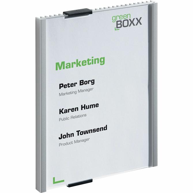 Information sign features a removable top clip for instant updates whenever changes occur. Clear acrylic panel completely showcases your insert for excellent visibility. Aluminum back plate is pre-drilled for easy wall mounting with the included screws and anchors. Plus, adhesive disks provide another way to mount the sign. The elegant back ribs form an attractive design that complements all decors. Use the free, online insert-formatting software to make professional style signs. Sign is compatible with Durable, printable replacement insert packs (sold separately).