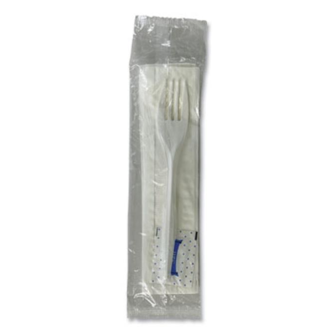 Why simply stock forks when you could include a napkin and salt packet in one convenient package? This three-piece utensil kit contains a fork, napkin, and salt packet in one convenient wrapping. The all-in-one package makes it much easier to carry and stock the essentials. Great for events, restaurants, cafeterias, to-go meals, and more. Simply stock or pack the kit alongside the meal and guests are ready for simple dining. Utensils Type: Fork; Napkin; Condiment; Material(s): Polypropylene; Paper; Color(s): White; Length: 7.1".