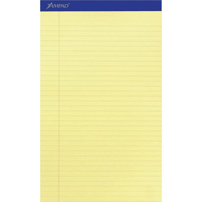Pad features 50 legal-size sheets of quality, yellow writing paper and a sturdy chipboard back. Dark blue header strip is attached with strong staples. Perforated pages in pad allow neat, no-tear sheet removal. Each legal/wide-ruled sheet has 11/32" line spacings and a 1-1/4" left margin.