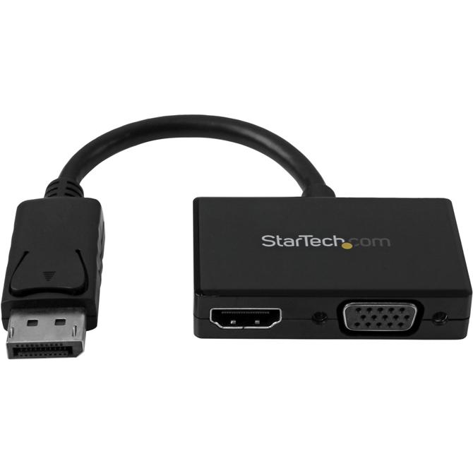 This DisplayPort to HDMI + VGA travel adapter lets you connect your DP enabled Ultrabook™or laptop computer to any VGA or HDMI® display. Connect to almost any display using a single adapter Why keepseveral adapters when you only need one With this single DisplayPort tor VGA and HDMI adapter you can rest assured that your computer caninterface with any modern boardroom or classroom display. It's the ideal plug-and-play solution for BYOD (Bring Your Own Device) applications at the office. Plus, because the converter supports video resolutions up to 1920x1200 or1080p, you can convert your DisplayPort video source to HDMIor VGAwithout sacrificing video quality. Enjoy maximum portability The travel A/V adaptermaximizes portability with a small footprint and lightweight design. This convenientconstruction ensuresthe adapter is as portable as your laptop, fitting easily into your laptop bag or carrying case and eliminates the need to carry more than one adapter. With this adapter you can walkinto virtually any boardroom ready to present, making a great first impressionand saving you the embarrassment of having to rummage through your bag looking for the right connector.Plus, the 2-in-1 converter installs easily with no software or drivers required. The StarTech.com DP2HDVGAis backed by a 3-year StarTech.com warranty and free lifetime technical support. More from the Manufacturer