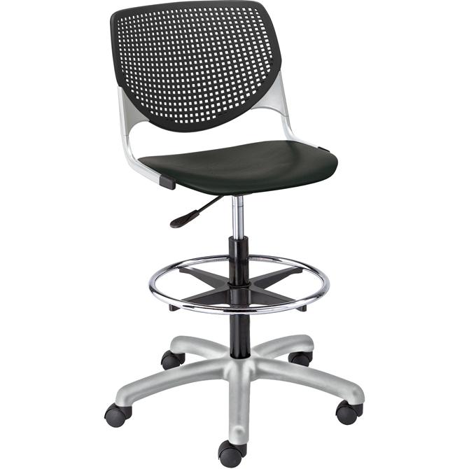 Kool Task Stool with solid color, polypropylene back and seat adds flair and comfort to any space. Ergonomic, perforated back offers an attractive design that enhances circulation and airflow. Radius conforms to your back for maximum comfort. The 12-gauge frame with 16-gauge, tubed steel provides a secure, supportive base for optimal longevity. Chair swivels 360 degrees for maximum movement. Pneumatic gas lift raises or lowers chair for optimal height options. Adjustable, chrome footring provides comfort in a relaxed position. Five-star base includes hooded, dual-wheel casters for easy mobility.