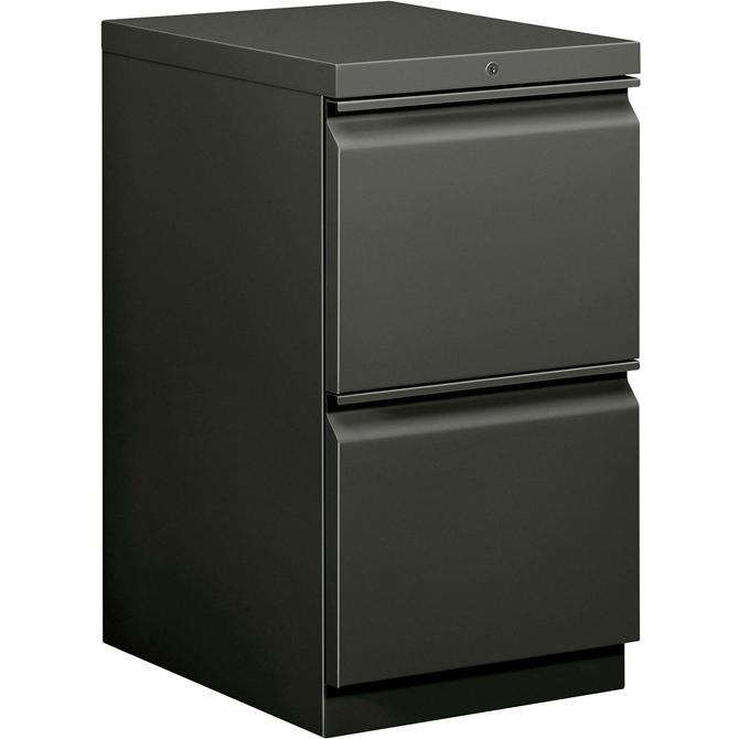 Mobile pedestal with HON Brigade Series 800 lateral-pull design fits under standard HON Initiate, 38000 Series and 29-1/2" worksurfaces. Freestanding pedestal offers a 19-7/8" depth and two file drawers with ball-bearing suspension (90 percent extension). High-sided file drawers feature two crossrails and accommodate front-to-back filing for letter-size, hanging file folders. Counterweight inhibits tipping when opening more than one drawer. Charcoal gray pedestal is also equipped with a HON One Key interchangeable, core-removable lock; fixed front casters; and swivel rear casters. Pedestal meets or exceeds ANSI/BIFMA and ISTA performance standards.