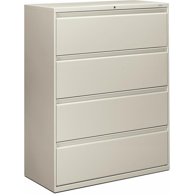 Four-drawer lateral file offers clean lines, reinforced case construction, 42" width, dual side locks for security, and full-width, designer-style handles. Baked enamel finish over rust-inhibiting, phosphate pretreatment adds more durability. Three-part, telescoping, ball-bearing suspension delivers smooth drawer operation. Drawers accommodate letter-size or legal-size folders from side-to-side with included adjustable hangrails. Drawers are flush at the top and sides and feature drawer-extension restraint. Mechanical interlock allows only one drawer to open at a time. Light gray lateral file also offers four adjustable leveling guides for stabilizing and HON One Key interchangeable, core-removable lock. Lock mechanism secures both sides of drawers.