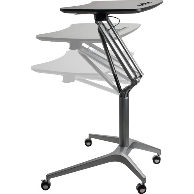 Use this height-adjustable mobile laptop caddy to move, stand and sit for a healthier workday. Gas-lift-operated arm raises the desktop up to 40.9" standing and lowers it to 28.7" for sitting. You can roll your desktop where you need it and sit or stand in offices or meeting rooms. Four easy-rolling casters swivel to overcome corners and busy hallways. Two of the casters lock for stability while you work. Sturdy base includes two generously spaced legs on the working side so your legs fit comfortably. The two legs on the public side feature a short extension and are close to each other so you can pull up to most desks and tables. Durable, black, stain-resistant laminate top includes a tablet holder and cup/pencil holder. Base is made of steel tube and aluminum base with a powder-coat finish for durability.