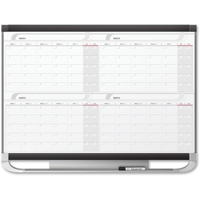 Prestige Total Erase Calendar offers four undated months for high visibility planning. Ideal in frequently used group or personnel environments. Durable Total Erase surface will not stain or ghost and resists dents and scratches, allowing new quarters to begin with a clean slate. Effectively display four months of important deadlines in the generous notes area and date description space. Each month has ruled daily blocks. The patented, "Easy Mount" hanging system allows simple and accurate installation. The calendar comes complete with a dry-erase marker and marker tray. Contemporary, graphite finish frame and modern graphics make a bold impact.