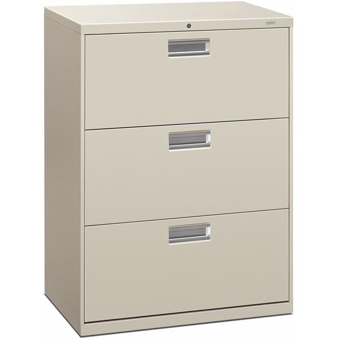 Three-drawer lateral file offers exceptional construction with double-walled base construction for maximum rigidity. Baked enamel finish over rust-inhibiting, phosphate pretreatment adds more durability. Telescoping, ball-bearing suspension delivers remarkably smooth drawer operation. Drawers accommodate letter-size or legal-size folders from side-to-side with included adjustable hangrails. Drawers are flush at the top and sides and feature drawer-extension restraint and aluminum, recessed drawer pulls. Mechanical interlock allows only one drawer to open at a time. 30" wide lateral file also offers four adjustable leveling guides for stabilizing; HON One Key interchangeable, core-removable lock; and reinforced case steel construction. Lock mechanism secures both sides of drawers.