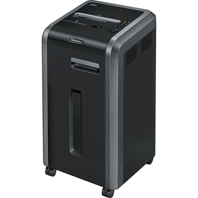 Powershred 225Ci Cross-Cut Shredder can shred up to 22 sheets of paper per pass into 397 (5/32" x 1-1/2" Security Level P-4) cross-cut particles. This machine also safely shreds CDs/DVDs, credit cards, staples, paper clips and junk mail. Achieve hassle-free shredding with all of the features the 225Ci has to offer. Get three levels of advanced jam prevention with Fellowes 100 percent Jam Proof System that eliminates paper jams, powers through tough jobs and maximizes productivity. To protect more than your identity, the patented SafeSense Technology is designed with an electronic safety sensor that surrounds the paper entry and automatically disables the shredder when hands touch the paper opening. Also, the 225Ci's SilentShred Technology and Energy Savings System allow this machine to integrate easily to any environment. With the ability to shred continuously, the 225Ci is ideal for shared use and includes a high-volume, 16-gallon removable basket.