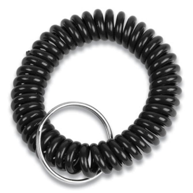 Easily keep track of important keys and belongings with this key holder. Flexible plastic extends to a comfortable fit on any wrist, while the steel key ring securely holds keys. Material(s): Plastic; Color(s): Black; Width: 2"; Depth: 2".
