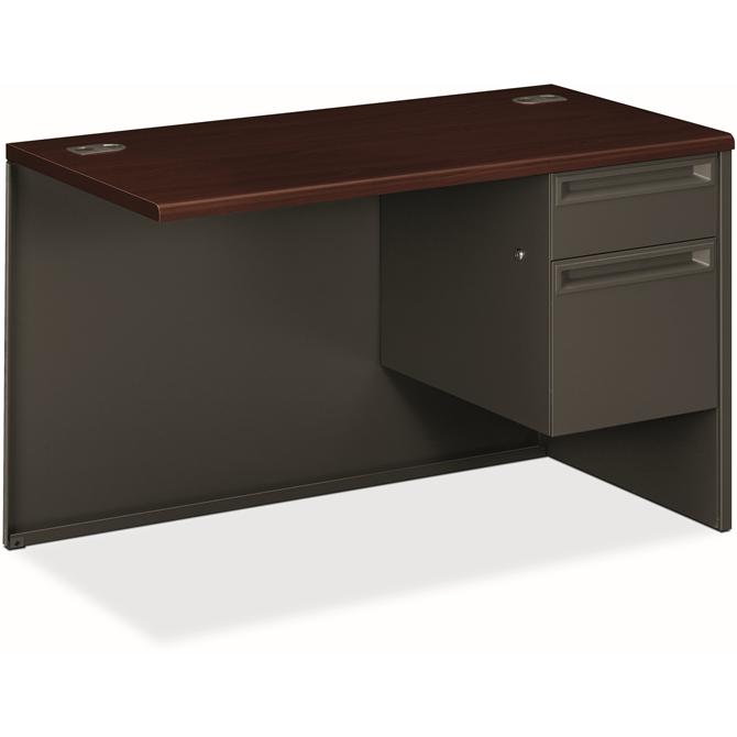 Modular steel desking combines your choice of easy-care laminate tops with sturdy steel body for a complete desk solution that's both attractive and durable. Mahogany laminate tops feature visually appealing rounded edges for a polished look and enhance your comfort. Wire management is made easy with cord-management grommets on desks and end panels to facilitate cable connections between desks. Desking also features steel ball-bearing suspension in all box and file drawers, "Tru-fit" mitered drawer fronts for better visual alignment, one pencil tray per unit except returns, and full-extension, triple-tied cradles on all file drawers for full access to interior contents. Desking meets or exceeds applicable ANSI/BIFMA standards.