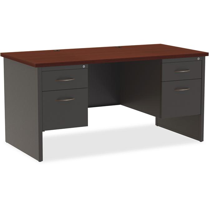 This modular desk series features commercial-quality performance and components. The durable steel chassis supports a 1-1/8" thick laminated top with integrated grommets for wire management. Laminate is stain-resistant and scratch-resistant for durability. To create a U-workstation, simply combine a desk with a bridge and credenza. Desk includes one box drawer for supplies and one file drawer for documents. File drawers with premium arch-pull handles accept hanging file folders for paper management. Steel ball-bearing suspension makes drawers easy to operate quietly. Built-in cord management provides easy access to power and data while minimizing clutter. The rich mahogany laminate and charcoal paint create an upscale look and feel for any application. Superior steel construction withstands heavy activity and relocation.