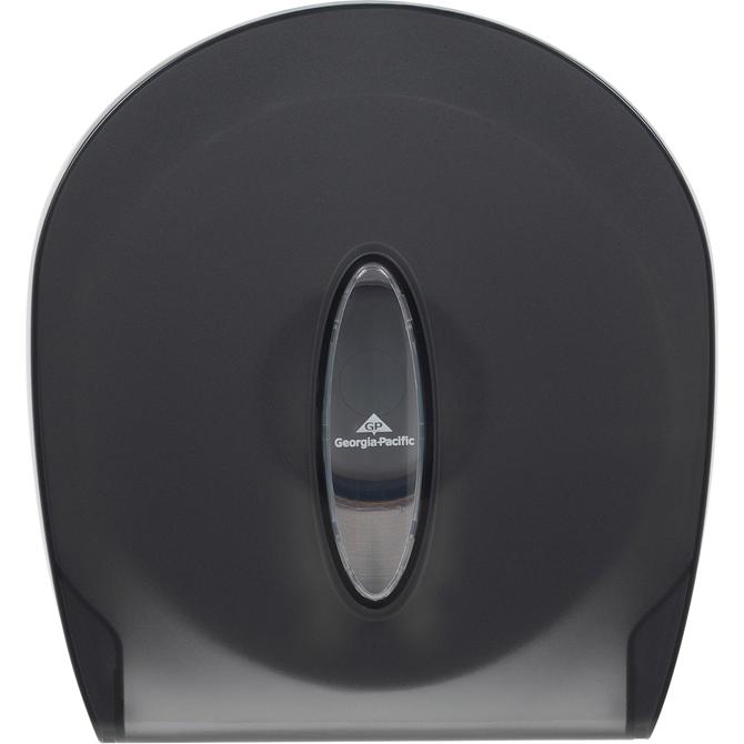 Durable, high-capacity bathroom tissue dispenser holds one roll of Georgia Pacific Jumbo Jr. tissue up to 9" in diameter - the equivalent length of 5.4 rolls of standard two-ply tissue. Covered, keylock design helps protect against waste and pilferage and makes refilling rolls quick and easy. High-impact plastic construction is durable and washable and stands up to most cleaning agents.