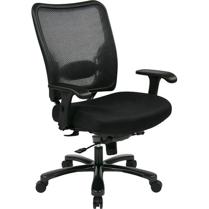 Executive Big and Tall Chair features a double air-grid back with adjustable lumbar support and thickly padded contoured mesh seat. Built-in arms adjust in height and width and feature soft polyurethane pads. Functions include one-touch pneumatic seat-height adjustment from 19-3/4" to 22-1/4" , mid-pivot knee tilt control, adjustable tilt tension and integral lumbar. Weight capacity is 400 lb. Seat size is 22" wide x 21" deep x 4-1/4" thick. Back size is 21-1/4" wide x 22" high. Heavy-duty five-star base with gunmetal finish offers five dual-wheel casters for easy chair movement.