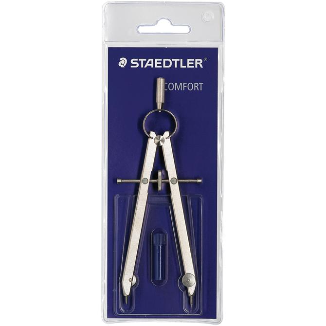 All-metal spring-bow compass feature a center wheel that delivers precision setting and prevents unintended setting adjustments. Maximum circle diameter is 10-3/8" (265mm). Design features interchangeable lead part and a nickel finish to resist rust and stains. Compass includes a spare lead tube and comes in a plastic wallet.