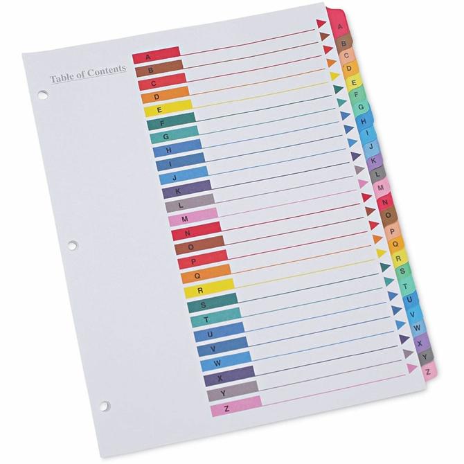 Organize your proposals, notes, reports, and files with professionally printed Table of Contents dividers. Simply print your selection titles on the Table of Contents page using your laser or inkjet printer. The three-hole punched white dividers feature multicolor laminated tabs and a Mylar® reinforced binding edge. Built with enhanced durability to prevent tear out. The built-in holes eliminate the need for a hole punch and ensure the tabs line up perfectly. Adaptable to both portrait and landscape orientations.