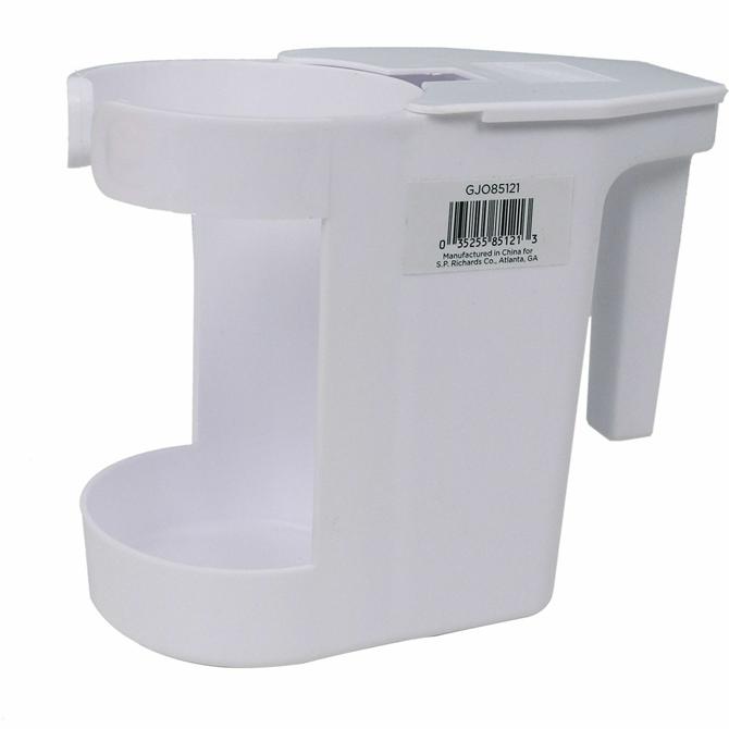 Toilet bowl mop caddy holds both a quart bottle and bowl mop for quick access and convenient mobility. Hinged lid covers the bowl mop to provide sanitary containment after each use. Comfortable carrying handle is easy to grip for safe transportation.