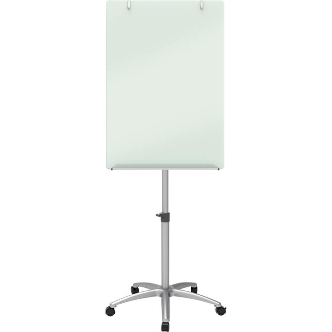 Mobile presentation easel is height-adjustable for better visibility to the entire audience. Glass surface is magnetic for dual-purpose use as a writing board and magnetic bulletin board. Durable, tempered-glass board is easy to clean. Top clamp lets you quickly attach flip charts. Smooth-rolling, five-caster base allows quick, easy mobility. Accessory tray keeps your writing utensils always within reach.