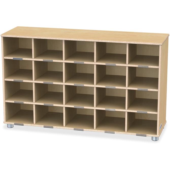 20-cubbie shelf without bins helps neatly organize a large variety of items. Name tag holders offer a quick and easy way to identify each cubby. Anodized aluminum feet provide durable function and a modern feel. Dowel-pin construction prevents weakening at the joints. Ultraviolet acrylic coating is durable and resists yellowing over time. KYDZSafe rounded edges allow children to play safely without getting hurt by sharp edges or corners.