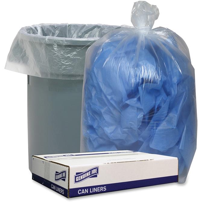 Clear, low-density liners feature a strong, resilient construction that securely holds a full load to easily transport bags to your disposal area. Star-bottom seal distributes the weight of contained items more evenly for dependable performance. Extra-strong design is leak-resistant to virtually eliminate liquids from escaping. Coreless roll is perforated for quick, simple access to liners.
