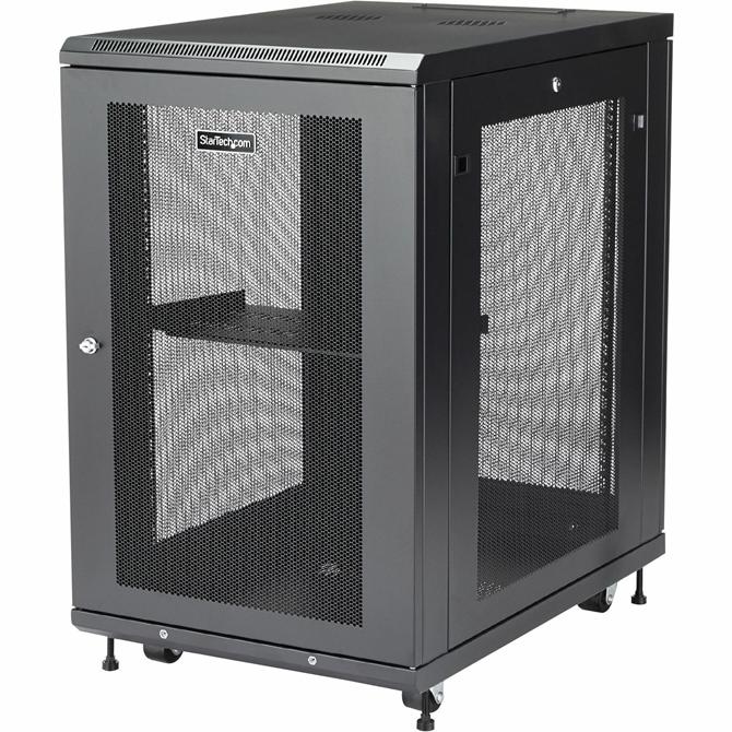 This server rack provides 18U of storage space in a sleek, secure cabinet for storing standard 19" rack-mount devices such as Dell, HP, and IBM servers, along with telecommunication and A/V equipment. The rack is compatible with EIA-310 compliant equipment and supports a total load capacity of 450 kg (992 lb.). Hassle-free equipment installation This rack includes a variety of features that enable you to easily incorporate plenty of equipment. With adjustable mounting rails, you can easily change the rail depth from 2" up to 30" (76.2 mm - 780 mm) to ensure compatibility your standard rack-mount equipment. The added depth also provides support for additional cable and power management behind your equipment. For hassle-free cable management, the rack includes a 3 meter roll of hook-and-loop cable tie that makes it easy to keep your cables neat and tidy by binding them together or binding them to the rack. The self-gripping fabric can be cut to any size, enabling a wrap-around solution for the cables of any rack-mount equipment. The rack features holes with covers on the ceiling and floor panels that make it easy to run cabling to the inside and outside of the cabinet, for discreet cable management. The rack also features grounding lugs that enable you to ground your equipment for added protection. This rack also includes a 1U shelf that gives you a stable surface for placing equipment that's not rack-mountable or storing your tools. To provide hassle-free deployment the rack ships fully assembled. Securely protect your equipment To keep your rack-mounted equipment secure, this rack features front and rear locking mesh doors. The mesh doors look great in any server room and help provide passive cooling. The doors are also reversible, which gives you the freedom to choose which side of the rack the door opens from, to suit your server room's spatial requirements. The rack also has removable side panels with independent quick-release locks that enable you to access your equipment easily, while still keeping it secure. Maximum Maneuverability, with casters included The cabinet features casters for hassle-free access to rear-mounted equipment while providing ease of mobility around your office, studio or server room. Plus, the width and height of the rack fit through standard doorways, giving you the freedom to wheel your server rack into different rooms. The RK1833BKM is backed by a StarTech.com 5-year warranty and free lifetime technical support.