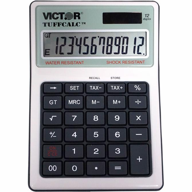 Washable TuffCalc is water-resistant and shock-resistant. Ideal calculator for extreme working conditions. Design features a sealed rubber keypad and acrylic-protected display. Large 12-digit display is easy to view. Functions include tax +/- keys, backspace, grant total, three-key memory, square root and change sign.