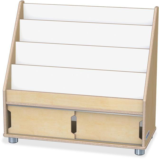 Book rack features four deep pockets for a perfect way to display your books. An extra storage compartment is designed underneath with sliding doors for a clean, modern look. Back features a Write-n-Wipe surface to provide extra functionality. Anodized aluminum feet provide durable function and a modern feel. KYDZSafe rounded edges allow children to play safely without getting hurt by sharp edges or corners. Dowel-pin construction prevents weakening at the joints.