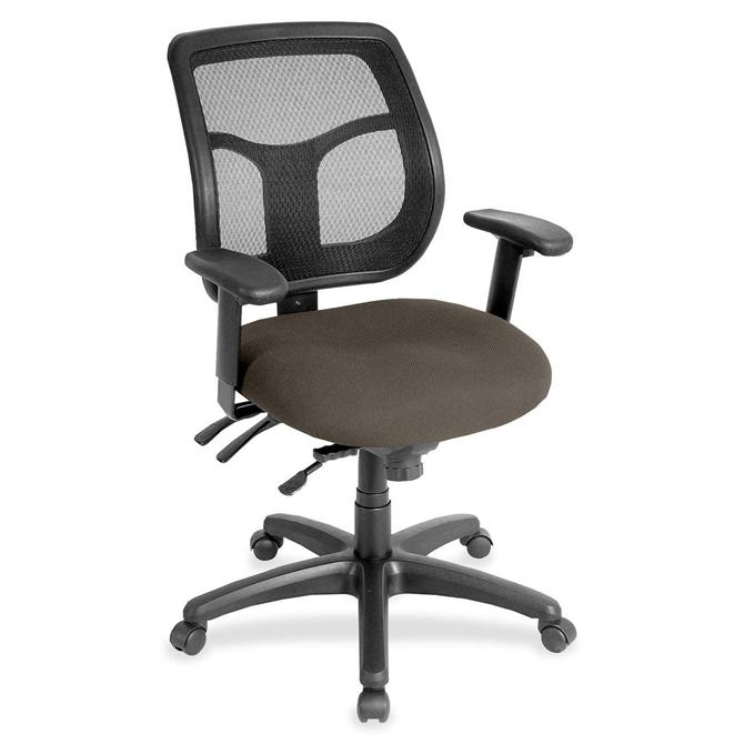 Apollo Multifunction Task Chair features a ratchet back that moves up or down relative to the seat for lumbar support and comfort. Mesh back provides enhances airflow for breathability. Set back at an angle for personalized comfort in reclined position. Seat-height adjustment lets you position the seat height relative to the floor. Chair rocks back and forth with adjustable, center-tilt mechanism. Fabric-upholstered, padded waterfall seat with sloping front reduces pressure on the back of the knees. Tilt-tension control with tilt lock allows you to adjust the recline rate based on your weight. Seat tilts forward to change the angle for a comfortable position when you're using a keyboard. Arm-height adjustment adjusts arm up or down while arm pads angle in or out. Nylon, five-star base features casters for easy mobility. Chair is Greenguard certified to have low chemical emissions.