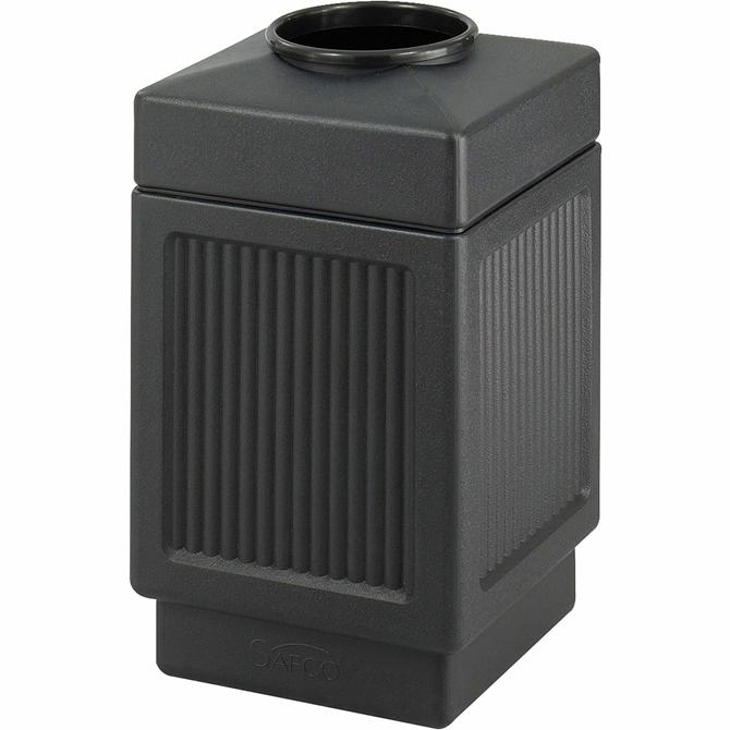 Indoor/outdoor waste receptacle with recessed panels features a square design and top opening. High-density polyethylene has built-in UV inhibitors to resist the harshest weather extremes. Telescoping base hides the bag. 38-gallon receptacle uses standard 32" x 44" trash bags and is easily adaptable for anchoring or weighting devices. Top opening measures 9-1/2" in diameter.