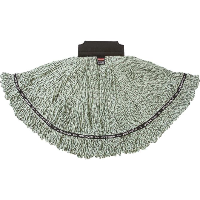 Mophead features the unique Maximizer Blend that delivers a high absorbency ratio and improved productivity. Made of precise combination of monofilament microfiber and unique Maximizer blend for durability, this medium-size mop offers 30 percent more floor coverage and 25 percent less weight than traditional mops. With industry-leading durability, this mophead is developed to withstand up to 100 commercial laundering cycles. Distinct color allows color-coding to easily distinguish and identify which products should be used in which areas of a facility, reducing cross-contamination. Universal headband works with industry-standard mop handles including Rubbermaid Commercial Invader and Gripper Clamp-style mop frames.