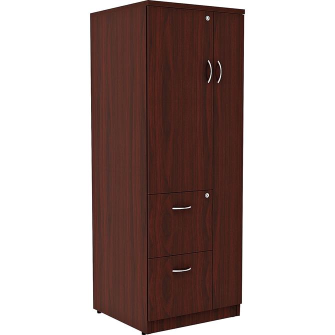 Tall storage cabinet can be used with Lorell Essentials or Relevance Series with high-quality laminate construction and metal-to-metal, cam-lock connections. Design of the cabinet expands your storage opportunities with the varied sizes of compartments. Full-length compartment on the right features a door to conceal contents. On the left, the half-length compartment includes a locking door and two shelves. Bottom two drawers lock to secure your belongings and hold letter-size files. Durable, Mahogany laminate surfaces provide a professional look and are abrasion-resistant. Back is finished on both sides. Cabinet is made of particleboard and medium-density fiberboard. Adjustable levelers help stabilize the cabinet on uneven surfaces.