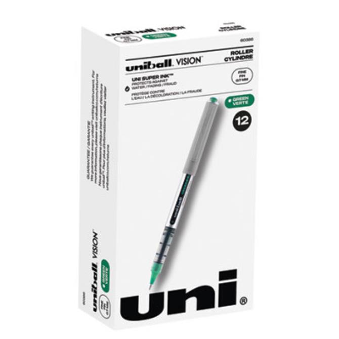 Make your everyday writing easy with the effortless and dependable performance of Vision Rollerball Pens from uni-ball featuring strong, long lasting tips. Capped roller pens deliver an even liquid ink lay-down for reliably smooth, vivid lines and a rich color for improved clarity and readability. Great for all writing tasks from taking notes to record keeping with archival quality, acid free roller ink. Innovative uni Super Ink technology forms an indestructible bond with the paper to minimize the risk of check washing or document fraud, while also protecting from water and fading. The exclusive Uni-Flow Ink System ensures a consistent, delightfully fluid writing experience, and a translucent window ensures that you don't run out of ink unexpectedly. Enjoy beautiful clean lines and give all of your ideas a burst of brilliant color with this classic style rollerball pen. Pen Sub-Brand & Product Family: VISION®; Pen Type: Roller Ball Pen; Pen Style: Stick; Pen Tip Type: Conical.