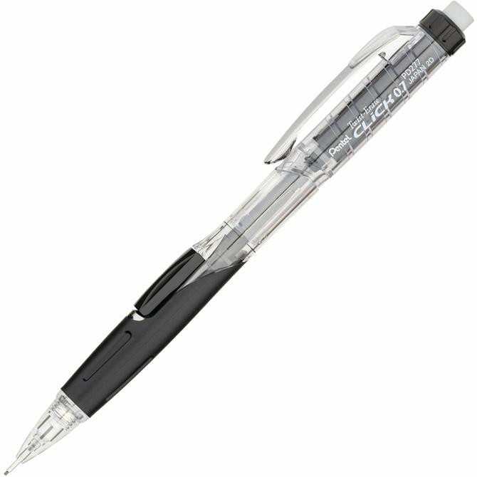 Quick-click side button advances lead without interrupting your writing. Mistakes are no match for the larger than ordinary and long lasting twist-up eraser. Clear barrels with colour accents for a stylish twist on pencils Extended comfort grip perfect no matter how you hold your pencil Durable metal clip withstands repeated use No smudges, no paper tears and no ghosts with the twist-up eraser Pre-loaded with Pentel Ain HB lead; never needs sharpening, is super strong and produces a clear dark line Available in 0.7mm lead size Part of Pentel's exclusive Recycology™ line of recycled products. Over 50% of the materials used to create these products were recycled materials