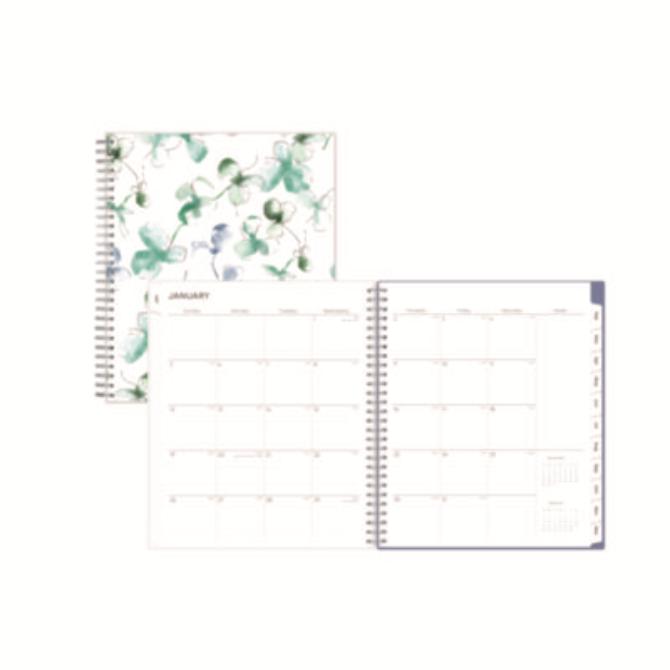 Add a touch of style to getting organized. Durable coated monthly calendar tabs allow for easy access to your month views while the two-page layout offers plenty of writing space for detailed scheduling. Standard calendar year plus six bonus months. Thick, premium acid-free pages reduce ink bleed-through. Durable frosted flexible front and solid back covers. Twin-wire binding finishes the look and offers easy page turning. Printed with soy-based ink. Dated: Yes; Academic Year: No; Calendar Format: Monthly; Calendar Spread Format: One Month per Two-Page Spread.