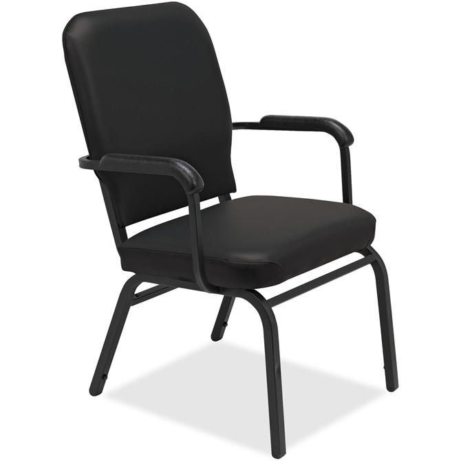 Oversized stack chairs with fixed, nylon-covered arms are weight-tested to hold 500 lb. to accommodate all visitors or participants. 3-1/2" thick seat and back are upholstered in antimicrobial vinyl to protect the product from germs and prolong its life. Seat measures 21" wide x 15" deep while the back size is 20-1/2" wide x 19-1/2" high. Durable, 18-gauge steel frame with four-leg base is powder-coated in black for durability. Chairs stack five high.