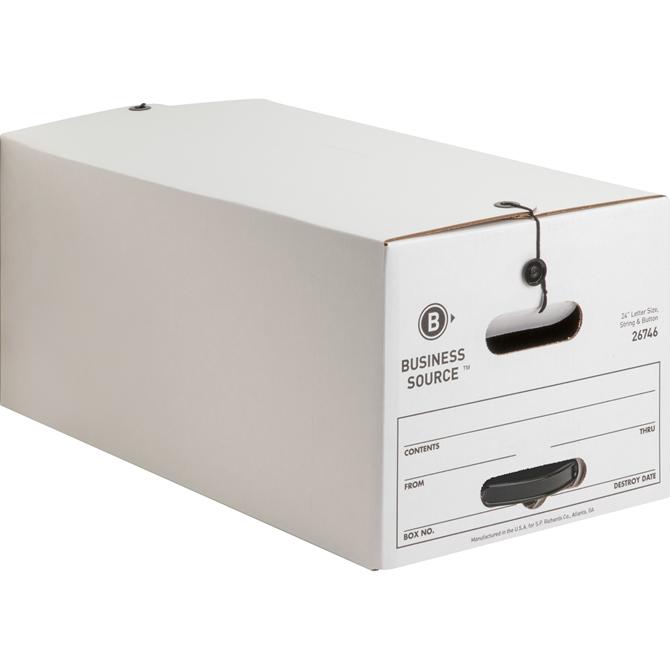 Storage box features sturdy corrugated construction for strength and value. String-and-button closure securely stores your letter-size files or other box contents. Quick setup means faster assembly. Medium-duty construction offers a stacking strength of 510 lb. Storage box is made with a high percentage of post-consumer recycled content.