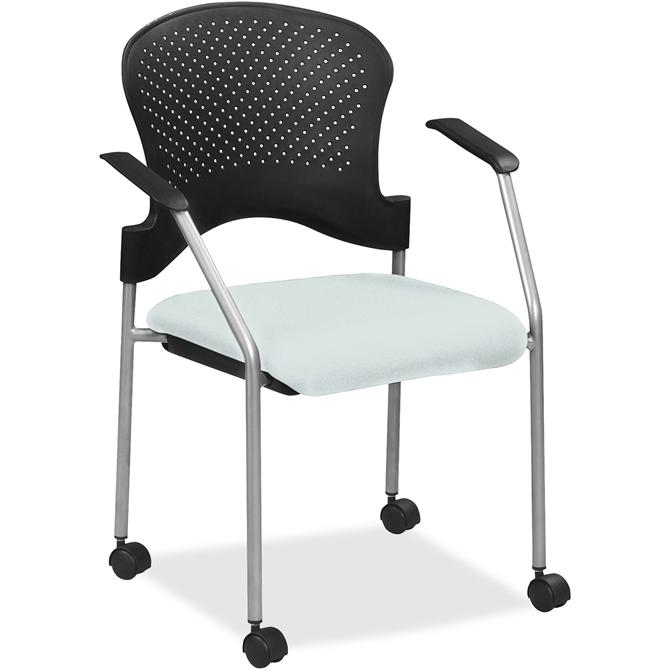Breeze Side Chair features a contemporary design, adding a modern touch to training rooms, boardrooms and more. Contoured back supports better posture for comfortable sitting during long periods. Castillo vinyl-upholstered, cushioned seat covers are made with soft-to-the-touch fabric, providing enhanced comfort. Armrests allow you to sit in a relaxed position. Powder-coated, steel tubing creates sturdy support and protects legs from chipping. Perforated back allows air to flow freely to help you stay cool. Included casters provide easy mobility.