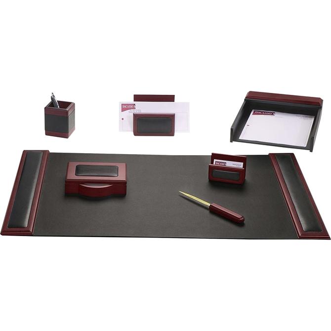Seven-Piece Desk Set features an assortment of durable supplies to help you work efficiently throughout the day. Top-grain leather adds professional style to any work space. Soft velveteen protects surfaces from scuffs and scratches. Desk set includes a desk pad, letter-size tray, pencil cup, memo holder, business card holder, letter opener and double pen stand.