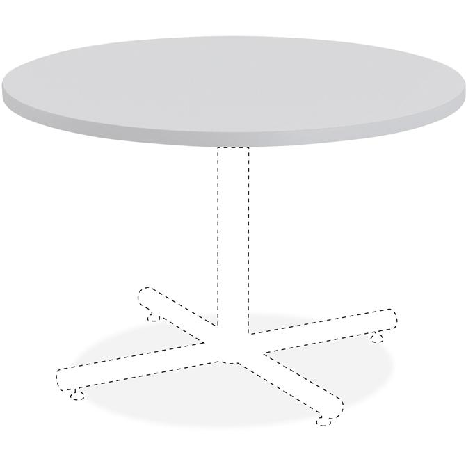 As part of the Lorell Hospitality Table Collection, this round tabletop is ideal for cafeterias or breakrooms. 1-1/4" thick top is made with high-pressure laminate for an inviting place to meet or snack. Durable, stain-resistant, scratch-resistant laminate is thermofused on the top and bottom to 45 lb. density particleboard core. Design features a matching light gray, vinyl T-mold edge. Tabletop also includes a pre-drilled hole for easy mounting of the X-leg base (sold separately).