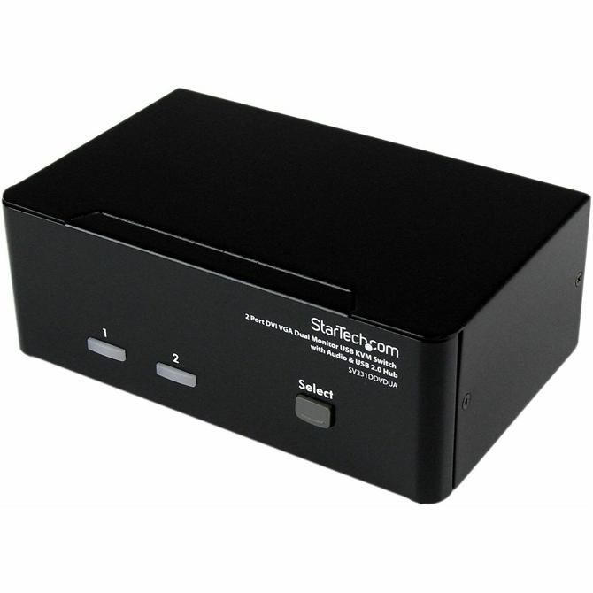 The SV231DDVDUA 2-port Dual Monitor KVM Switch (DVI+VGA) offers a complete multimedia switching solution, letting users control two Dual Display computers using a single USB mouse and keyboard peripheral set. With support for high-resolution video interfaces, this dual view KVM switch provides one VGA (analog) and one DVI-I port per computer connection, as well as audio switching capability between connected computers. Delivering versatility for virtually any application, the DVI/VGA KVM switch features an integrated 2-port USB hub that allows connected USB 2.0 peripherals to be shared between connected computers, eliminating the need to purchase duplicate peripherals. Suitable for any workspace, the dual monitor KVM switch offers a compact desktop KVM design and features a rugged metal chassis that helps ensure durable performance. This product is TAA compliant and backed by a Startech.com 3-year warranty with free lifetime technical support. More from the Manufacturer
