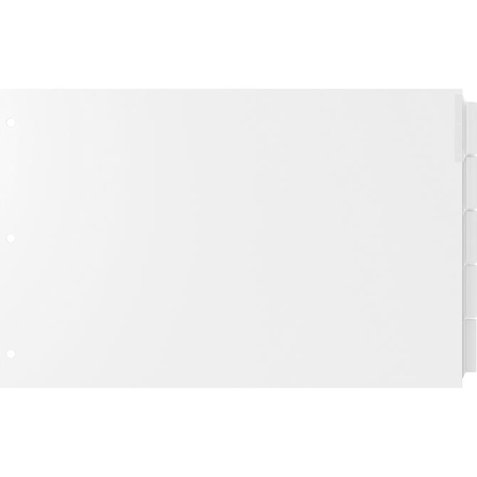 Index dividers are tabbed and sized to fit 8-1/2" x 14" landscape paper in legal binders. Each divider is three hole-punched, and the holes are reinforced. Set of five with clear tabs includes blank white inserts.