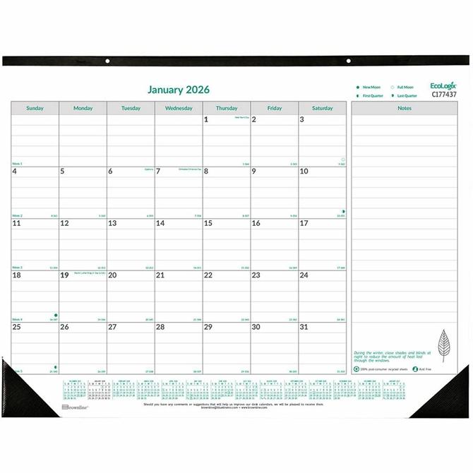 Monthly desk pad is made with a high percentage of recycled post-consumer material and features an ecological tip on each page. One-page-per-month format includes unruled daily blocks, Sunday-through-Saturday scheduling, moon phases, count of days/days remaining, holidays, an unruled notes column and a 14-month calendar reference on the bottom. Dated planning pages range 12 months from January to December and are bound at the top with a headband. The current reference month is bolded. Desk pad also offers a headband, two corners to secure pages and a reinforced chipboard back to protect your desktop.