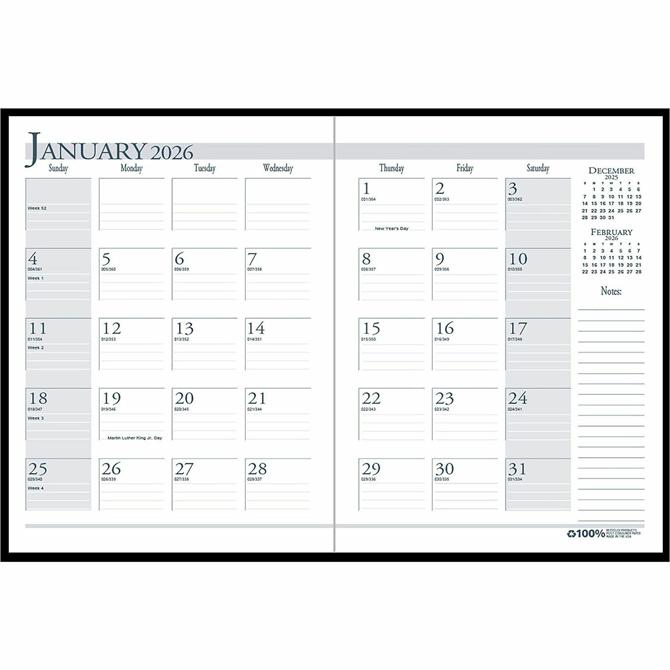 Recycled monthly planner features a stitched, black leatherette cover to protect your planning. Planning pages range 14 months from December to January. Two-page-per-month spreads include large, lightly ruled daily blocks (1-1/2" x 1-1/4"); holidays; count of days/days remaining; Sunday-through-Saturday scheduling; a ruled notes area along the side; and past and future months reference near the top right corner. Nonrefillable planner contains paper made with a high percentage of recycled material.