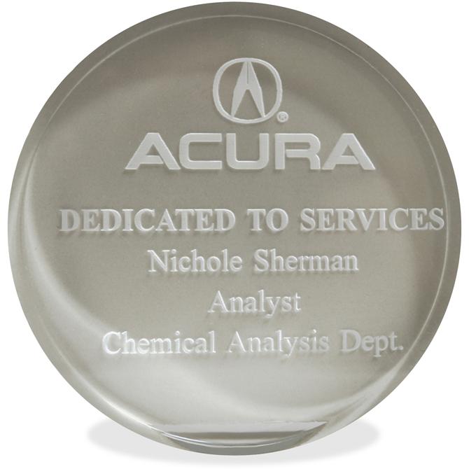 Honor your recipient with a modern, stylish, laser-engraved paperweight award. It is manufactured from polished, hand-cut, high-quality acrylic. Impression size is 3-1/2" in diameter so you have plenty of room for your logo and message.