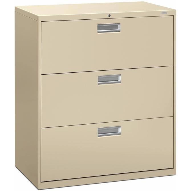 Three-drawer lateral file offers exceptional construction with double-walled base construction for maximum rigidity. Baked enamel finish over rust-inhibiting, phosphate pretreatment adds more durability. Telescoping, ball-bearing suspension delivers remarkably smooth drawer operation. Drawers accommodate letter-size or legal-size folders from side-to-side with included adjustable hangrails. Drawers are flush at the top and sides and feature aluminum recessed drawer pulls and drawer-extension restraint. Mechanical interlock allows only one drawer to open at a time. 36" wide lateral file also offers four adjustable leveling guides for stabilizing; HON One Key interchangeable, core-removable lock; and reinforced case steel construction. Lock mechanism secures both sides of drawers.