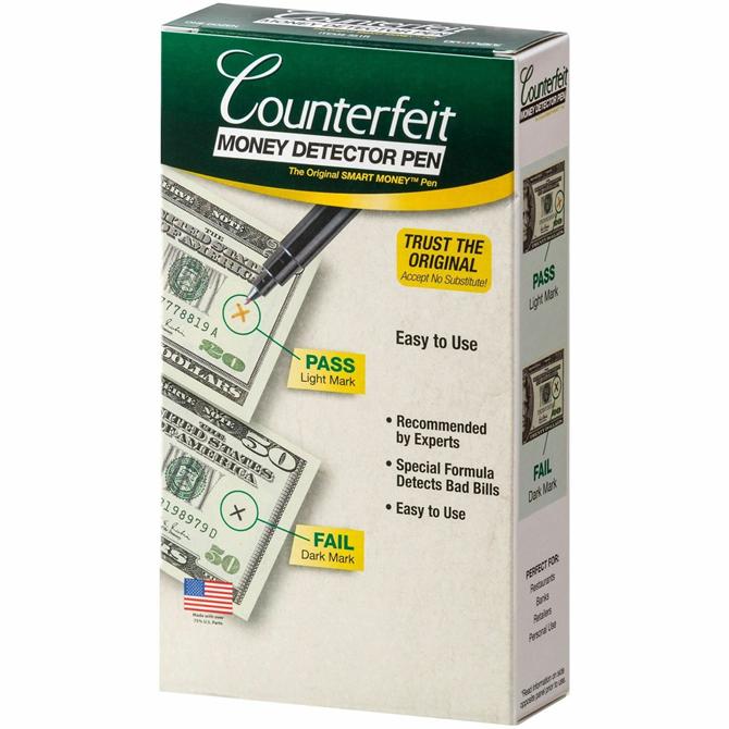 Counterfeit Money Detector Pens are ideal for use in busy retail environments. This quick, inexpensive, currency-screening device can be used in conjunction with other counterfeit detection methods. Mark a small line on U.S. currency. When mark is amber, the bill is genuine. If mark is black or dark brown, the bill is suspect.