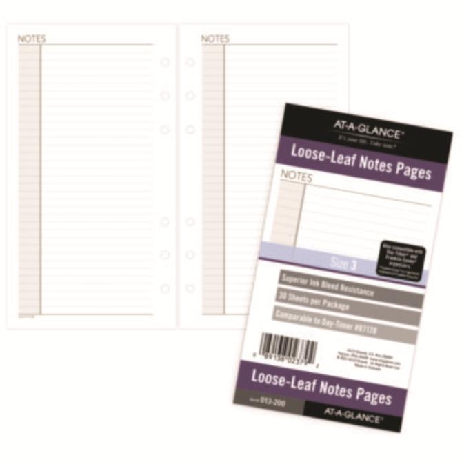 Lined notes pages are loose-leaf for easy insert and removal. High-quality paper features superior ink bleed resistance. Undated format to use anytime for list and notes of all kinds. Punched for fit with any matching size ring planner or organizer. Dated: No; Academic Year: No; Julian Dates: No; Size (Bound-Side First): 6.75 x 3.75.